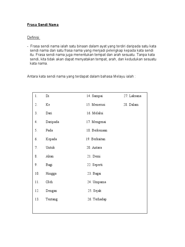 Up to 24 cash back 4 Frasa Sendi Nama FS Frasa sendi nama ialah binaan dalam ayat yang terdiri daripada satu sendi nama dan frasa nama yang menjadi pelengkap kepada. Kata sendi nama frasa nama kata sendi nama dalam frasa sendi nama hadir sebagai perkataan yang terletak di hadapan frasa nama. Dalam ayat 2 pula sendi nama untuk terletak di hadapan kata nama Ali untuk menghasilkan frasa sendi nama untuk Ali yang menjadi predikat ayat.